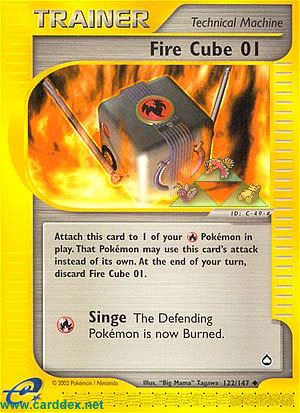 Lege diese Karte an 1 deiner -Pokémon im Spiel an. Dieses Pokémon kann den Angriff dieser Karte anstatt seiner eigenen verwenden. Lege am Ende deines Zuges Feuer-Würfel 01 auf deinen Ablagestapel.