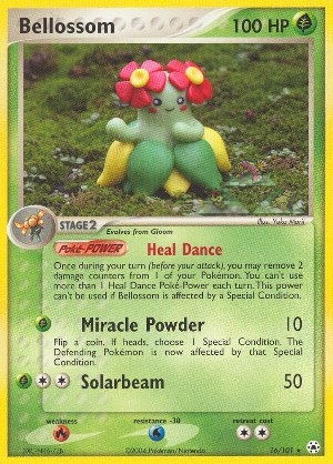 Once during your turn (before your attack), you may remove 2 damage counters from 1 of your Pokémon. You can't use more than 1 Heal Dance Poké-Power each turn. This power can't be used if Bellossom is affected by a Special Condition.