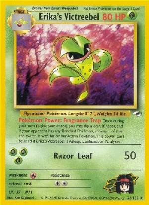 Once during your turn (before your attack), you may flip a coin. If heads, and if your opponent has any Benched Pokémon, choose 1 of them and switch it with his or her Active Pokémon. This power can't be used if Erika's Victreebel is Asleep, Confused, or Paralyzed.