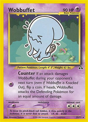 Kosten: If an attack damages Wobbuffet during your opponent's next turn (even if Wobbuffet is Knocked Out), flip a coin. If heads, Wobbuffet attacks the Defending Pokemon for an equal amount of damage.  Schaden: