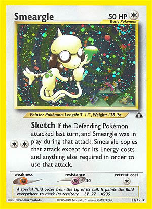 Kosten: If the Defending Pokemon attack last turn, and Smeargle was in play during that attack, Smeargle copies that attack execpt fpr its Energy costs and anything else reguired in order to use that attack.  Schaden: