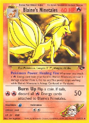 Whenever you attach a Energy card from your hand to Blaine's Ninetales, remove 1 damage counter from it, if it has any. This power stops working while Blaine's Ninetales is Asleep, Confused, or Paralyzed.