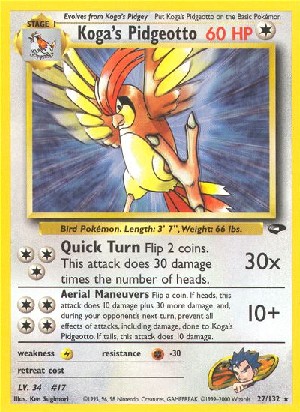 Flip a coin. If heads, this attack does 10 damage plus 30 more damage, and during your opponent's next turn, prevent all effects of attacks, including damage, done to Koga's Pidgeotto. If tails, this attack does 10 damage.