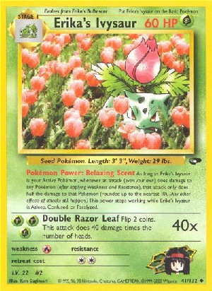 As long as Erika's Ivysaur is your Active Pokémon, whenever an attack (even your own) does damage to any Pokémon (after applying Weakness and Resistance), that attack only does half the damage to that Pokémon (rounded up to the nearest 10). (Any other effects of attacks still happen.) This power stops working while Erika's Ivysaur is Asleep, Confused, or Paralyzed.