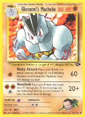 Flip a coin. If tails, this attack does no damage to the Defending Pokémon and Giovanni's Machoke does 100 damage to itself.