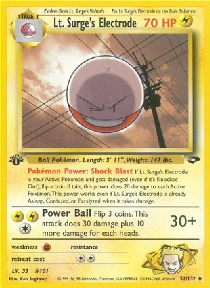 If Lt. Surge's Electrode is your Active Pokémon and gets damaged (even it is's Knocked Out), flip a coin. If tails, this power does 20 damage to each Active Pokémon. This power works even if Lt. Surge's Electrode is already Asleep, Confused, or Paralyzed when it takes damage.
