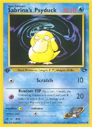 Kosten: Flip a coin. If heads, the Defending Pokémon is now Confused. If tails, this attack does no damage and Sabrina's Psyduck is now Confused.  Schaden: