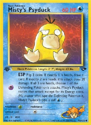 Flip 3 coins. If exactly 1 is heads, draw a card. If exactly 2 are heads, this attack does 20 damage. If all 3 are heads, choose 1 of the Defending Pokémon's attacks. Misty's Psyduck copies that attack except for its Energy costs. (No matter what ype the Defending Pokémon is, Misty's Psyduck is still .)