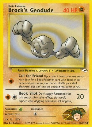 Kosten: Flip a coin. If heads, you may search your deck for a Basic Pokémon card with Brock in its name and put it onto your Bench. Shuffle your deck afterward. (You can't use this attack if your Bench is full.)  Schaden: