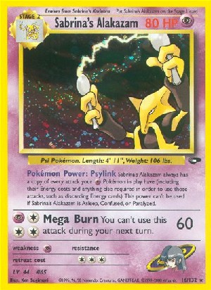 Sabrina´s Alakazam always has a copy of every attack your Pokemon in play have (including their Energy costs and anything else required in order to use those attacks, such as discarding Energy cards). This power can´t be used if Sabrina´s Alakazam is Asleep, Confused or Paralyzed.