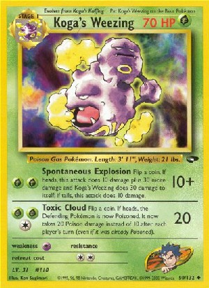 Flip a coin. If heads, this attack does 10 damage plus 30 more damage and Koga's Weezing does 30 damage to itself; if tails, this attack does 10 damage.