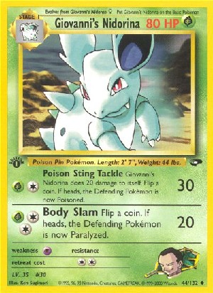 Kosten: Giovanni's Nidorina does 20 damage to itself. Flip a coin. If heads, the Defending Pokémon is now Poisoned.  Schaden: