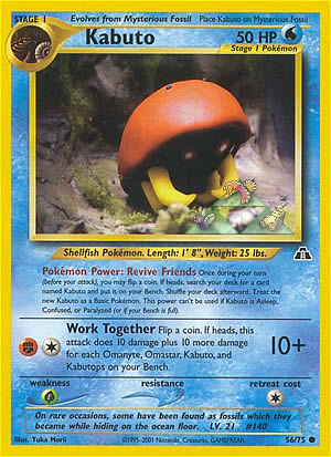 Once during your turn (before your attack), you may flip a coin. If heads, search your deck for a card named Kabuto and put it on your Bench. Shuffle your deck afterward. Treat the new Kabuto as a Basic Pokémon. This power can't be used if Kabuto is Asleep, Confused, or Paralyzed (or if your Bench is full).