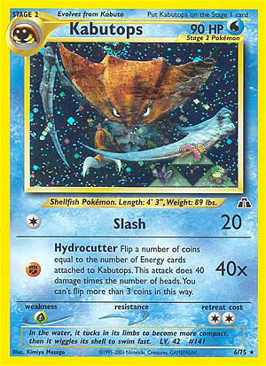 Kosten: Flip a number of coins equal to the number of Energy cards attached to Kabutops. This attack does 40 damage times the number of heads. You can't flip more than 3 coins in this way.  Schaden: