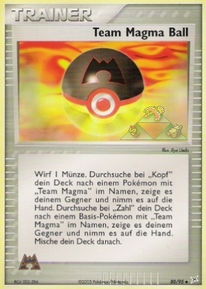Beschreibung: Wirf I Münze. Durchsuche bei Kopf dein Deck nach einem Pokémon, das "Magma's" im Namen hat. Durchsuche bei Zahl dein Deck nach einem Basispokémon, das "Magma's" im Namen hat. Mische dein Deck danach.