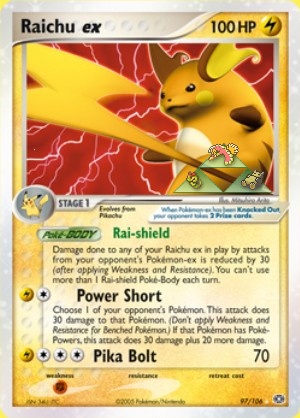 | Eingetragen von: Iruini | Pokémon-EX: Wenn Raichu ex kampfunfähig wird, nimmt dein Gegner 2 Preise. |