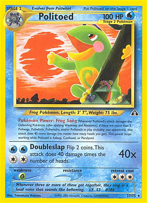 Wenn mehr als drei Quapsel, Quaputzi, Quappo und/oder Quaxo im Spiel (auch die deines gegners) und wenn Quaxos Angriff dem verteidigenden Pokemon Schaden zufügt (nachdem Schwäche und Resistenz verrechnet wurden), fügt dieser Angriff 40 weitere Schadenspunkte zu (unabhängig davon, wie oft du "Kopf" geworfen hast). Deise Fähigkeit verliert ihre Wirkung, solange Quaxo schläft, verwirrt oder gelähmt ist.