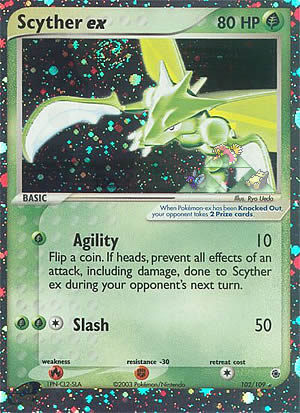 Kosten: Flip a coin. If heads, prevent all effects of an attack, including damage, done to Scyther ex during your opponent's next turn  Schaden: