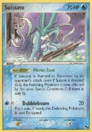 If Suicune is Burned or Poisoned by an opponent's attack (even if Suicune is Knocked Out), the Attacking Pokemon is now affected by the same Special Conditions (1 if there is only 1).