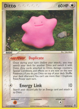 Once during your turn (before your attack), you may search your deck for another Ditto and switch it with Ditto. (Any cards attached to Ditto, damage counters, Special Conditions, and effects on it are now on the new Pokémon.) If you do, put Ditto on the top of your deck. Shuffle your deck afterward. You can't use more than 1 Duplicate Poké-Power each turn.