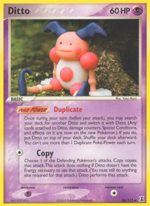 Once during your turn (before your attack), you may search your deck for another Ditto and switch it with Ditto. (Any cards attached to Ditto, damage counters, Special Conditions, and effects on it are now on the new Pokémon.) If you do, put Ditto on top of your deck. Shuffle your deck afterward. You can't use more than 1 Duplicate Poké-Power each turn.