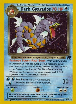 When Dark Gyarados is Knocked Out by an attack, flip a coin. If heads, this power does 20 damage for each Energy attached to Dark Gyarados to the Pokemon that Knocked Out Dark Gyarados. Apply Weakness and resistance. This power doesn't work if Dark Gyarados is Asleep, Confused, or Paralyzed.