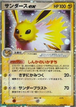 | Eingetragen von: Iruini | Pokémon-EX: Wenn Blitza ex kampfunfähig wird, nimmt dein Gegner 2 Preise. |