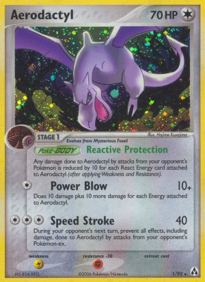 Jeder Schaden, der Aerodactyl durch Angriffe gegnerischer Pokémon zugefügt wird, wird für jede an Aerodactyl angelegte Reaktions-Energiekarte um 10 Schadenspunkte reduziert (nachdem Schwäche und Resistenz verrechnet wurden).