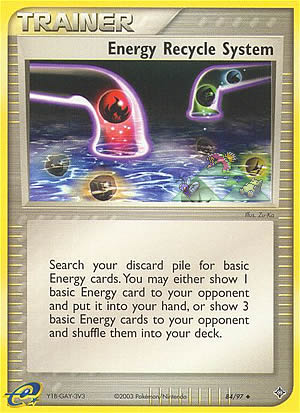 Beschreibung: Durchsuche deinen Ablagestapel nach Basis-Energiekarten. Wähle entweder 1 Basis Energiekarte, zeige sie deinem Gegner und nimm sie auf die Hand oder wähle 3 Basis Energiekarten, zeige sie deinem Gegner und mische sie in dein Deck.