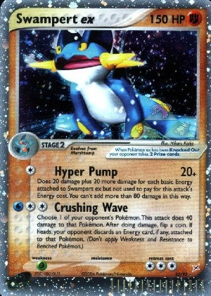 Kosten: Does 20 damage plus 20 more damage for each basic Energy attached to Swampert ex but not used to pay for this attack's Energy cost. You can't add more than 80 damage in this way.  Schaden: