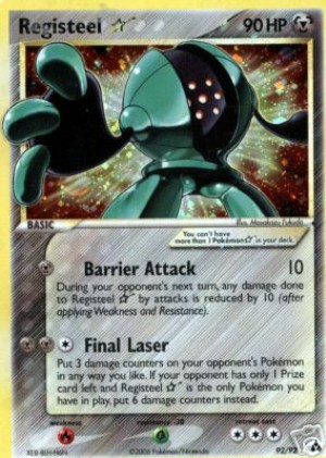 Im nächsten Zug deines Gegners wird Schaden, der Registeel * durch Angriffe zugefügt wird, um 10 Schadenspunkte reduziert (nachdem Schwäche und Resistenz verrechnet wurden).