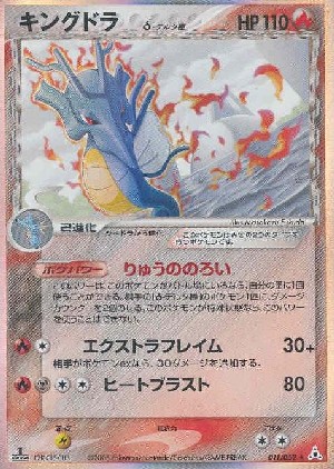 You can use this power once during your turn, if Kingdra is your Active Pokémon. Place 2 damage counters on 1 of your opponent's "delta species" Pokémon. This power can't be used if Kingdra is affected by a Special Condition.