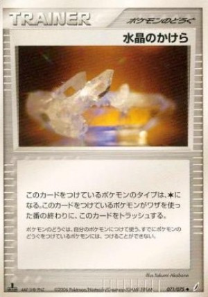Lege Kristallscherbe an 1 deiner Pokémon an, das keine Pokémon-Ausrüstung hat. Wenn dieses Pokémon kampfunfähig wird, lege diese Karte auf deinen Ablagestapel.