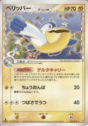 You can use this power once during your turn, if Pelipper is on your Bench. Choose 1 of your Active 'delta species' Pokémon and switch it with 1 of your Benched Pokémon.