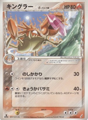 Kosten: If Kingler has any Pokémon Tool cards attached to it, this attack does an additional 40 damage.  Schaden: