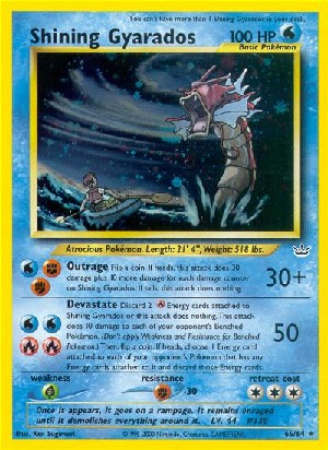 Lege 2 an Schimmerndes Garados angelegte -Energiekarte auf deinen Ablagestapel,oder dieser Angriff hat keine Ausirkungen. Dieser Angriff fügt jedem Pokemon auf der gegnerischen Bank 10 Schadenspunkte zu. (Wende Schwäche und Resistenz für Pokemon auf der Bank nicht an.) Wirf dann eine Münze. Wähle bei Kopf bei jedem Pokemon deines Gegners, an das mindestens eine Energiearten angelegt ist, eine dieser Energiekarten und lege sie auf den Ablagestapel deines Gegners. |