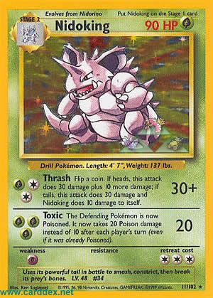 Wirf eine Münze. Bei Kopf fügt dieser Angriff 30Schadenspunkte plus 10 weitere Schadenspunkte zu. Bei Zahl fügt dieser Angriff 30 Schadenspunkte zu, und Nidoking fügt sich selbst 10 Schadenspunkte zu.