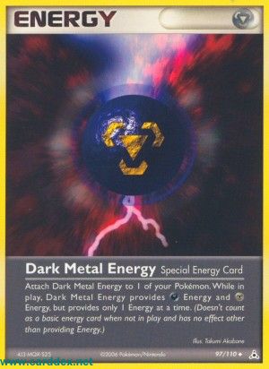 Beschreibung: Lege Finstere Metall-Energie an 1 deiner Pokémon an. Während Finstere Metall-Energie im Spiel ist, liefert diese Karte - und -Energie, aber immer nur 1 Energie auf einmal. (Zählt nicht als Basis-Energiekarte, wenn sie nicht im Spiel ist und hat keinen Effekt, außer dass sie Energie spendet.)