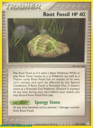 Beschreibung: Spiele Wurzelfossil wie ein Basis-Pokémon. Während Wurzelfossil im Spiel ist, zählt es als -Pokémon (anstatt einer Trainerkarte). Wurzelfossil hat keine Angriffe, kann sich nicht zurückziehen und wird nicht von Speziellen Zuständen betroffen. Falls Wurzelfossil kampfunfähig gemacht wird, zählt es nicht als kampfunfähig gemachtes Pokémon (lege es trotzdem ab). Jederzeit während deines Zuges vor deinem Angriff kannst du Wurzelfossil aus dem Spiel ablegen. |