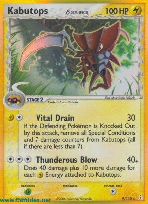 Wenn das Verteidigende Pokémon durch diesen Angriff kampfunfähig wird, entferne alle Speziellen Zustände und 7 Schadensmarken von Kabutops (alle, wenn weniger als 7 Schadensmarken auf Kabutops liegen).