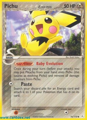 Einmal während deines Zuges (vor deinem Angriff) kannst du Pikachu von deiner Hand auf Pichu legen (das zählt als Entwickeln von Pichu). Entferne alle Schadensmarken von Pichu.