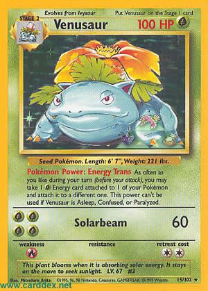 Bist du am Zug, kannst Du (vor deinem Angriff) beliebig oft eine auf einem Deiner Pokemon abgelegte Energiekarte nehmen und auf ein anderes legen. Diese Fähigkeit kann nicht eingesetzt werden, falls Bisaflor schlafend, verwirrt oder gelähmt ist.