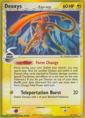 Während deines Zuges (vor deinem Angriff) kannst du ein Mal dein Deck nach einer anderen Deoxys-Karte durchsuchen und diese gegen Deoxys austauschen. (Alle an Deoxys angelegten Karten sowie Schadenspunkte, Spezielle Effekte auf Deoxys werden auf das neue Pokemon übertragen.) Wenn du dies machst, lege Deoxys auf dein Deck. Mische dein Deck danach. Du kannst nicht mehr als 1 Gestaltwandel Poke-Power pro Zug einsetzen.