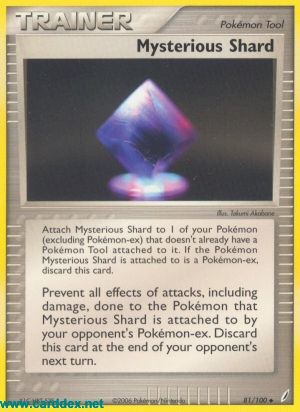 Beschreibung: Verhindere alle Effekte von Angriffen, inklusive Schaden, die dem Pokémon, an das Mysteriöser Splitter angelegt ist, von gegnerischen Pokémon-ex zugefügt werden. Lege Mysteriöser Splitter am Ende des nächsten Zuges deines Gegners auf deinen Ablagestapel.