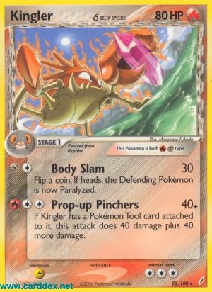 Kosten: Wenn an Kingler eine Pokémon-Ausrüstung angelegt ist, fügt dieser Angriff 40 Schadenspunkte plus 40 weitere Schadenspunkte zu.  Schaden: