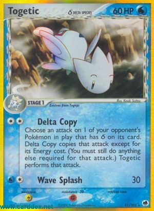 Kosten: Wähle 1 Angriff von 1 im Spiel befindlichen Pokémon deines Gegners, auf dem δ zu sehen ist. Delta-Kopie kopiert diesen Angriff, mit Ausnahme der Angriffskosten. (Du musst immer noch alles tun, was verlangt wird, um diesen Angriff durchzuführen.) Togetic benutzt den kopierten Angriff.  Schaden: