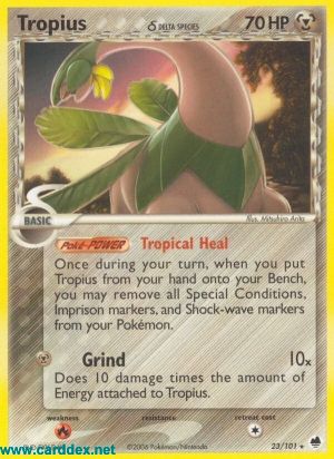 Einmal während deines Zuges, wenn du Tropius von deiner Hand auf die Bank legst, kannst du alle Speziellen Zustände, Begrenzer-Marken und Stromschlag-Marken von deinen Pokémon entfernen.