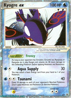As long as your opponent has Groudon, Groudon ex, Rayquaza or Rayquaza ex in play, Kyogre ex's attacks do 40 more damage to the Defending Pokémon (before applying Weakness and Resistance).