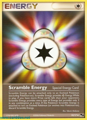 Scramble Energy can be attached only to an Evolved Pokemon (excluding Pokemon-ex). Scramble Energy provides Energy. While in play, if you have more Prize cards left than your opponent, Scramble Energy provides every type of Energy but provide only 3 in any combination at a time. If the Pokemon Scramble Energy is attached to isn't an Evolved Pokemon (or evolves into Pokemon-ex). discard Scramble Energy.