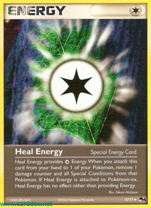 Beschreibung: Heal Energy provides Energy. When you attach this card from your hand to 1 of your Pokemon, remove 1 damage counter and all Special Conditions from that Pokemon. If heals Energy is attached to Pokemon-ex, Heal Energy has no effect other than providing Energy.